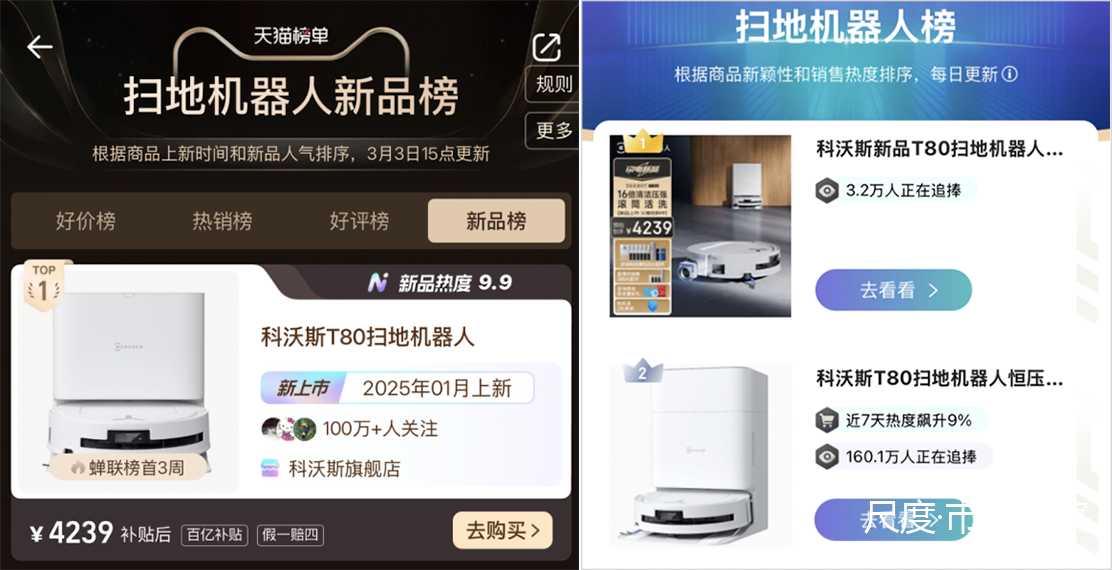 今年2月,科沃斯全新一代滚筒活水洗地机器人T80正式上市,从预售开始仅1个月的时间便登上天猫扫地机器人新品榜,并连续3周蝉联榜首,而在京东扫地机器人新品热卖榜,更是一款产品占据第一、第二和第九三个排名(不同店铺)。考虑到科沃斯本身就是业内线下门店最多的品牌,拿到线上第一可以说已经意味着T80是全渠道最强新品。