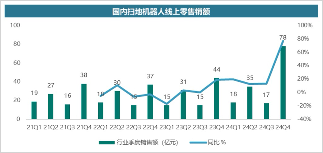 奥维云网的数据显示,在以旧换新政策出台前的2024年前三季度,扫地机线上销售额分别为18亿、35亿、17亿,而到2024Q4,这个数据飙升到78亿。