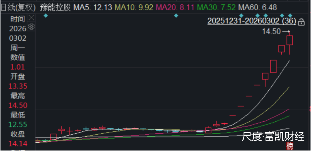 3月2日,豫能控股继连续7个涨停板后股价再次上涨,当日股价冲高至14.5元/股。
